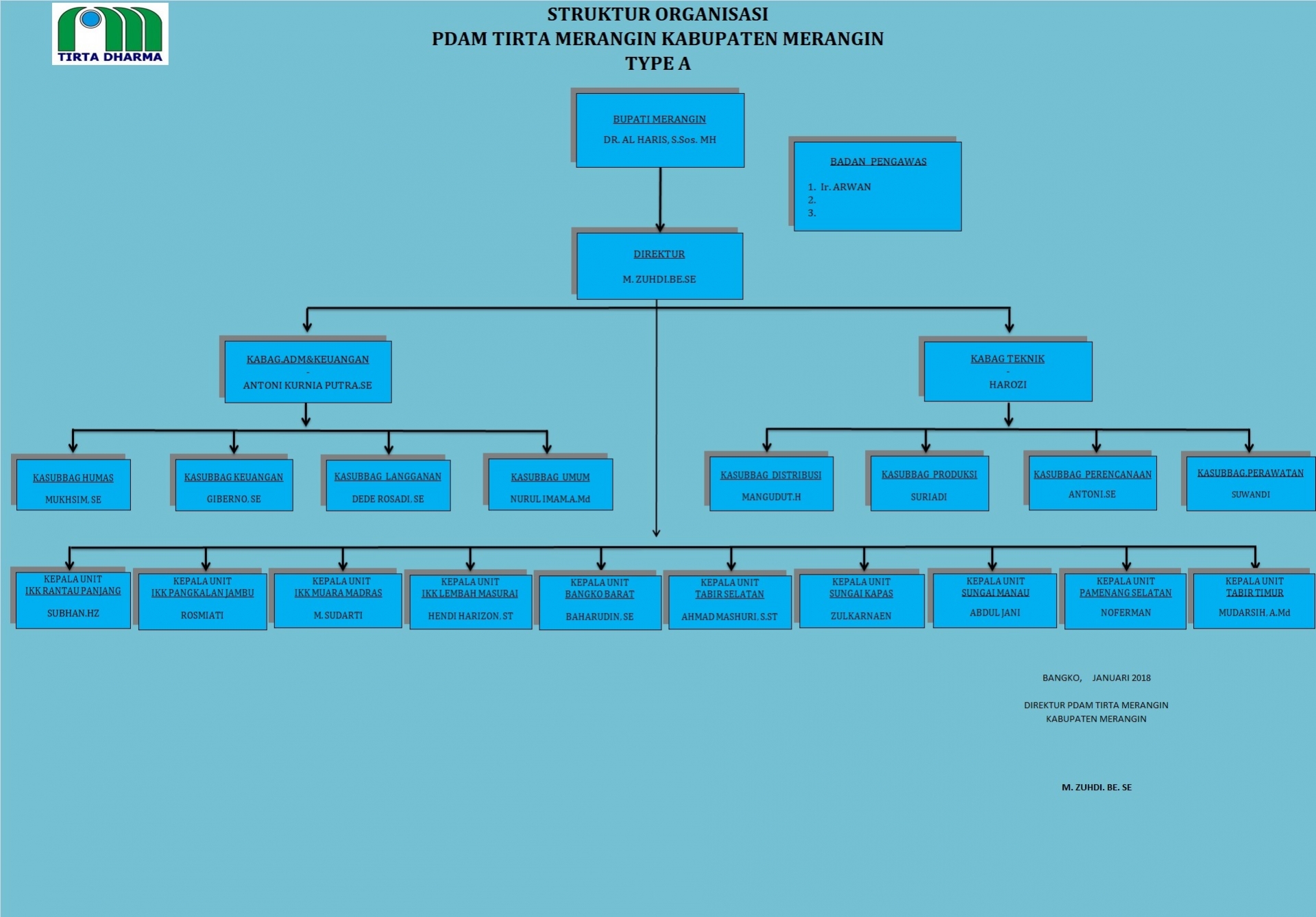 Struktur Organisasi yang ada dan berlaku saat ini adalah Struktur Organisasi yang didasarkan pada Peraturan Daerah Kabupaten Merangin Nomor 11 Tahun 2010 tentang Perusahaan Daerah Air Minum Tirta Merangin Kabupaten Merangin. Struktur Organisasi Perusahaan berbentuk struktural dan fungsional, dimana komando terletak pada Direktur, struktural melekat pada Kepala Bagian dan Kepala Seksi sedangkan fungsional melekat pada Staf Ahli Direktur.
